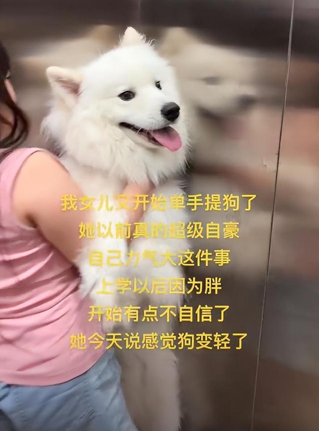 视频显示,女孩可以单手提起一只萨摩耶犬。