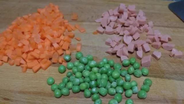 1、将胡萝卜削皮和火腿肠一起切成小颗粒,然后将玉米粒和豌豆洗干净。