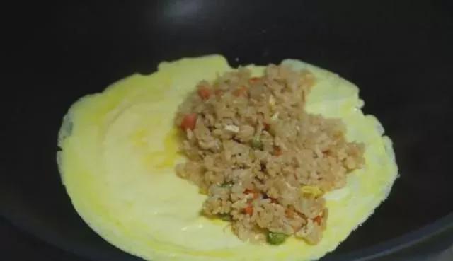 7、然后将米饭放在鸡蛋饼的一侧,再将鸡蛋饼对折起来,将边缘封口即可。
