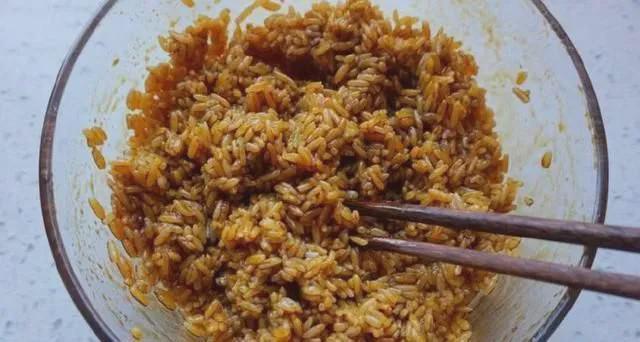 1、用剩米饭炒最合适了,将冰箱的米饭拿出来加1勺酱油搅拌均匀待用,将小葱切碎待用。