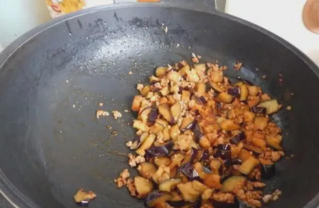 2、将腌好的茄子挤干水分。锅中倒油,下入肉末翻炒,变色之后倒入生抽上色。