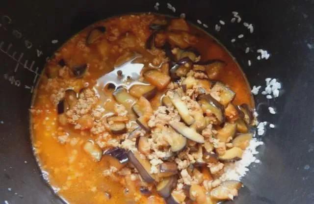 4、然后将洗好的大米放在电饭锅中,再倒入肉末茄子,倒入适量水,开始煮米饭即可。