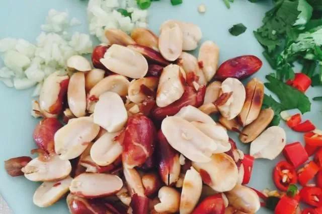 2、锅中倒入适量油,下入花生仁小火煸炒,炒变色捞出,晾凉后擀碎待用。