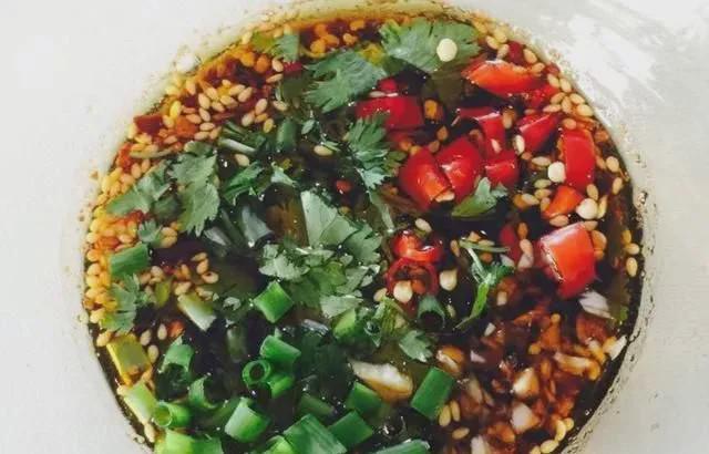 3、准备一个小碗,加入生抽、老抽、麻油、蚝油、陈醋、白糖、盐、鸡精、十三香、辣椒油、香菜、香葱、泰椒和蒜末混合成调料汁。