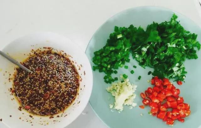 1、将香菜、香葱和大蒜切成末,泰椒切成小段,准备一碗辣椒油待用。