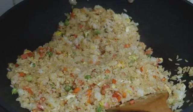4、将配料翻炒断生之后,下入米饭,将米饭炒散,加入盐和胡椒粉调味。