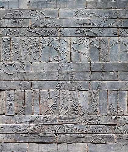 这幅“竹林七贤”与荣启期画像,绘制在由200多块古砖拼砌而成的墙面上,砖块或横或纵,在砖块侧面发现有“嵇下行四”“向下行廿一”等刻字样,可以推测,这幅砖画图应原有一粉本(即底稿),由工人将画面拆分后制成模具,模印成砖,再将砖块按照顺序拼合起来,并砌入墓室。这种墓葬装饰艺术从设计到施工是一个相当复杂的过程,最后在墓中呈现出的,虽然是看似简单的平面化图像,却是一场工艺接力的结果,可以看到当时工艺水准已经十分成熟高超。
