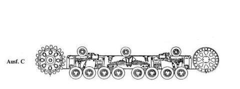 C型也是采用平衡悬挂,也同样采用8对负重轮的设计,但是板簧的设置不同。前面2个负重轮,采用一组小型板簧作为悬挂;中间4个负重轮,采用一组大型板簧;最后2个负重轮,采用一组小型板簧。