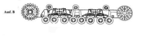 B型采用板簧平衡式悬挂,每边有两组板簧,每组板簧安装2个小直径负重轮,4对板簧,共8对负重轮。