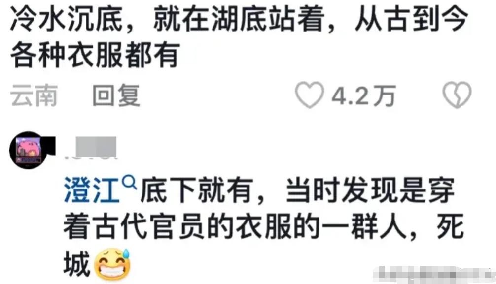 关于抚仙湖的这些传说,并非空穴来风。2001年,央视的一次考古节目直播在抚仙湖意外中断,据说是因为录到了水下站立的尸体。这一事件在当时引起了轰动,也让抚仙湖的神秘色彩更加浓厚。许多网友纷纷表达了对抚仙湖深邃水面的恐惧和好奇,他们猜测这些尸体是如何来到这里的,是否与古滇国的遗址有关。
