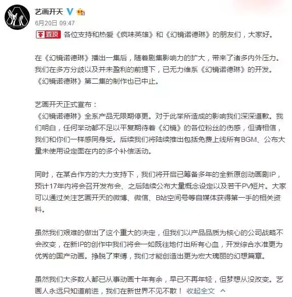 不过,从最开始据说的随缘更,如今直接止步在了第一集,官方在本周二宣布《幻镜诺德琳》全系产品无限期停更。