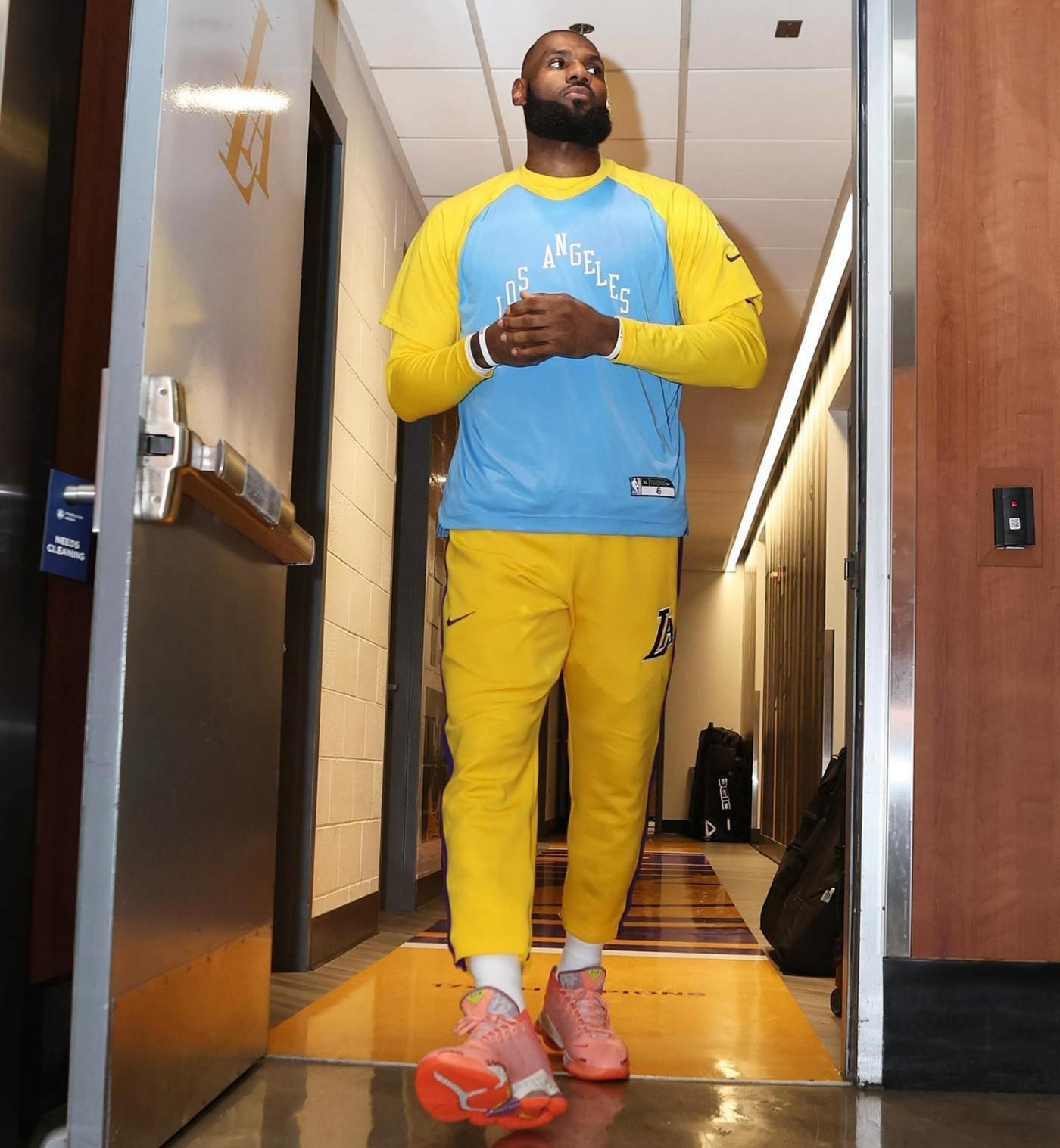 詹姆斯穿的这一套黄色的套装运动款式出场还是很有感觉的!!我觉得很帅!!特别加上这双粉色的篮球鞋哦!!