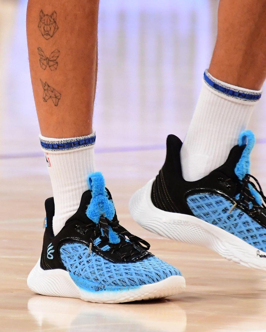 这双首发球鞋的配色采用的是红头蓝屁股的设计,灵感来源于作为3D球员(加入3D球员的意思解读)的克莱汤普森本人的球风,进攻端可以火热到单节37分,防守端可以限制对位球员的进攻能力。