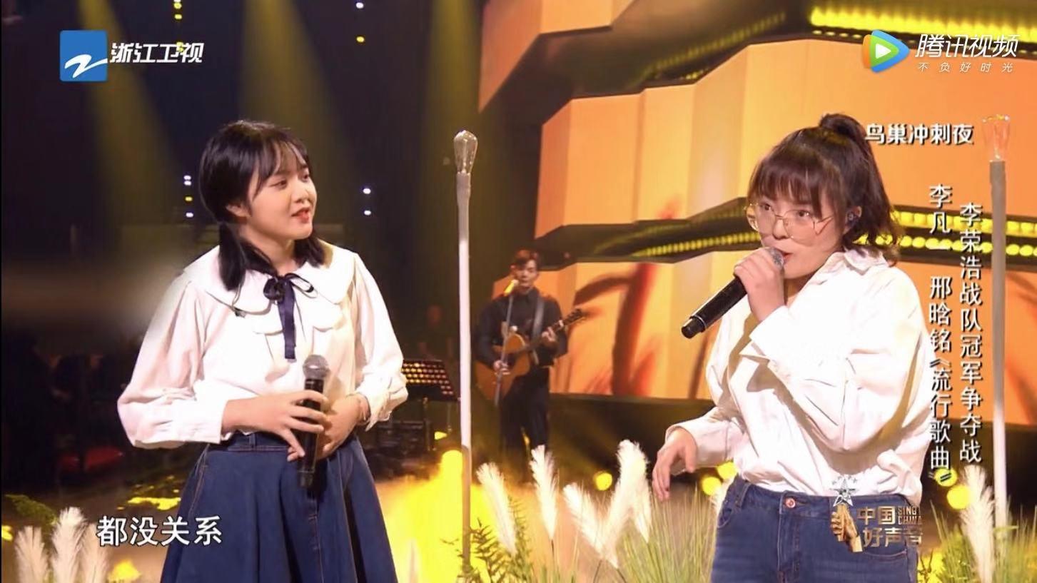 两人用好声音最被人诟病的比赛方式,两人合唱一首歌进行比较。