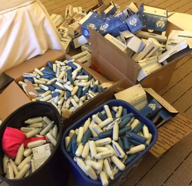 另一方面,房间里还散落着多个小钢瓶,这些小钢瓶中装的全都是“笑气”。经过清点发现,现场一共有16箱笑气,共3800多支,其中13箱已经被吸完,1箱没有吸完,还有两箱没有开封。