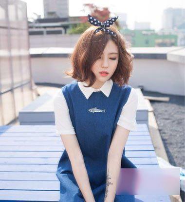 日韩系妹纸的梳短发发型,将两边的头发顺着眼角外侧梳成蓬松的样子,偏分烫短发发型,将发顶上的头发从脖颈位置梳一下层次烫发,用发箍给头发梳比较有层次的模样,发型很可爱。