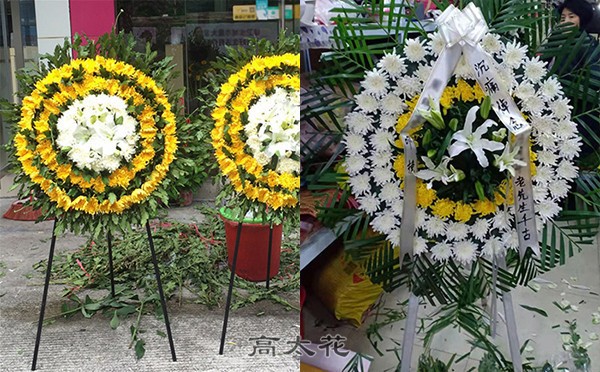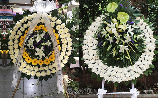 花圈都是采用菊花制作,有的花圈是用白菊或者黄菊铺设花圈圈,整体为白色花圈或者黄色花圈,这类花圈较为简约素净,更加大气。
