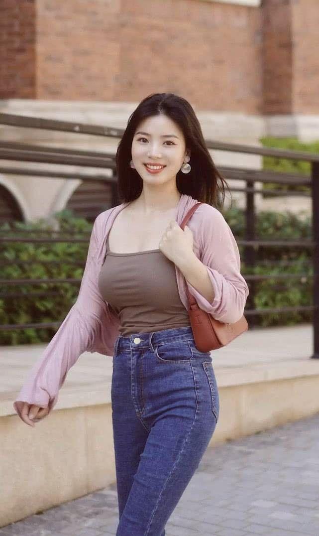 穿牛仔裤的美女,身材丰腴圆润,笑容甜美,尽显女人味