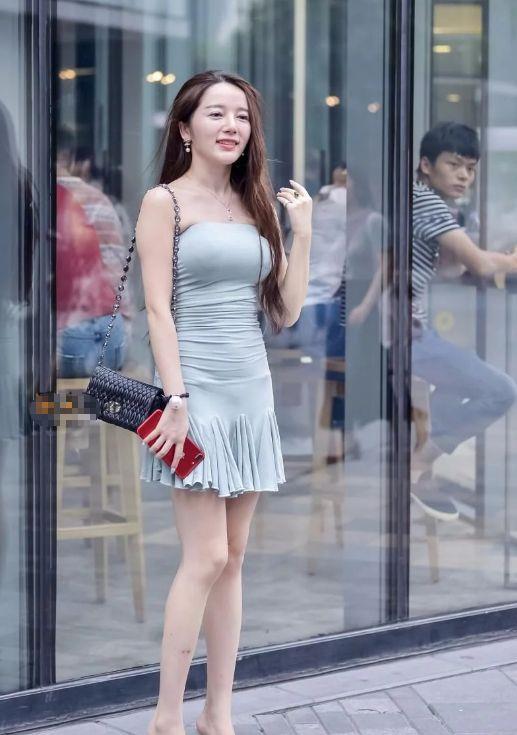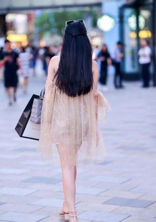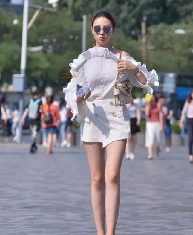 美女身穿肉色露肩短裙,白皙的皮肤,修长的美腿,悠闲的步伐很是性感妩媚。