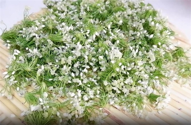 2.韭菜花洗好之后,我们把它放在一个帘子上,把它晾干,这样做出来的韭菜花不至于快速的腐败。