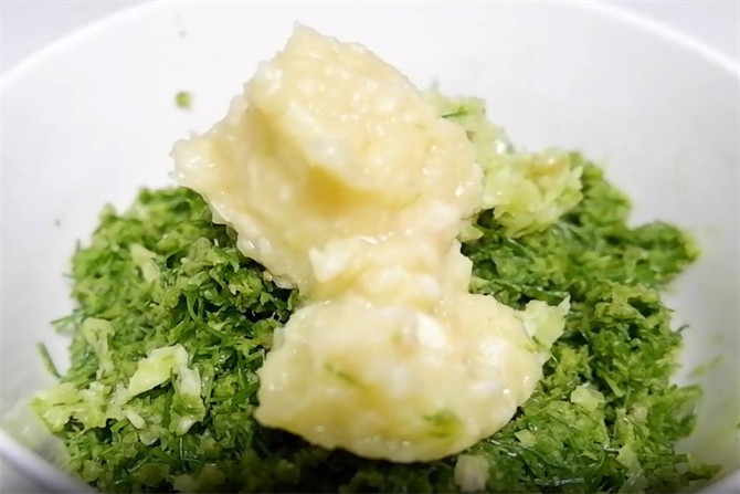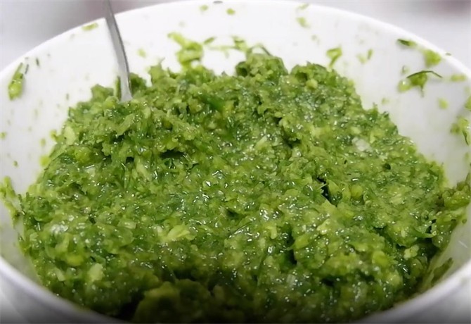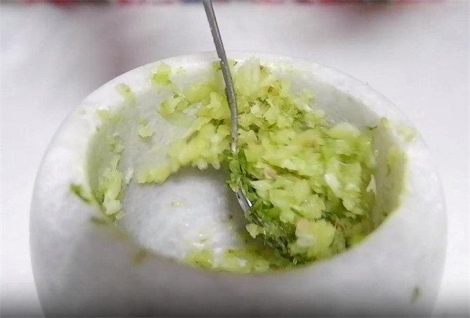 4.韭菜花捣好之后,再捣一些姜蒜。