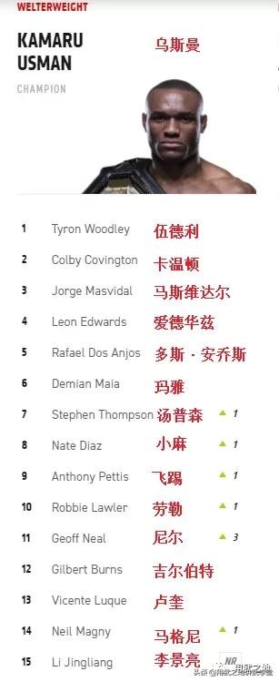 说回到排名,从这一次UFC排名走势来看,次中量级11-15位的排名很有可能因为一场比赛便会有很大的变化。杰夫·尼尔在12月14日UFC 245的副赛中TKO了没有排名的迈克·佩里,这一次直接从第14位上升到了第11位。此前,用武之地报道预计的李景亮下一位对手马格尼,排名上升到了第14位。