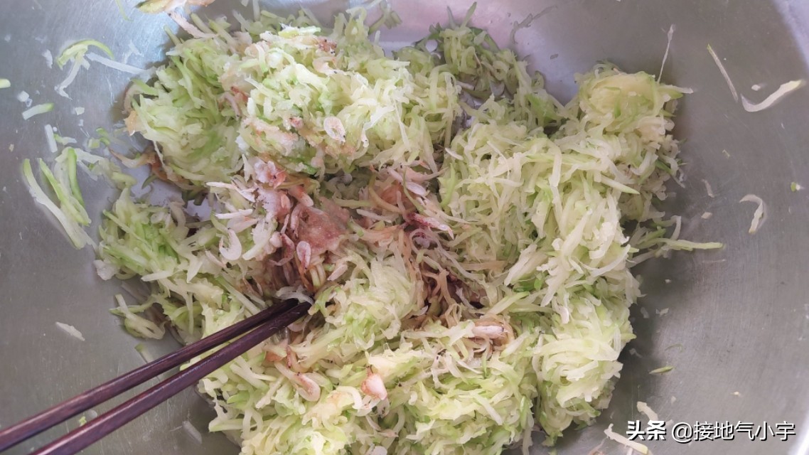 (2)准备一个盆,里面放入擦好的西葫芦丝,加葱末多加加一点蒜末,根据自己的口味加少量生抽,放适量蚝油,香油,适量食用油,神秘一物出现了,就是加入“虾皮”,由于虾皮有咸味,加盐要少一点。最后加一点鸡精,把馅料搅拌均匀备用。