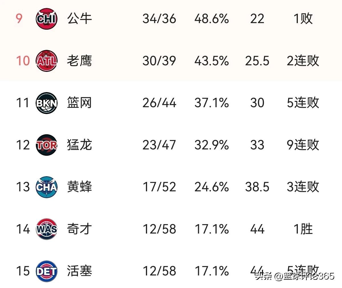 2.东部排名榜第9-15名:目前公牛战绩34胜36负,落后榜首凯尔特人22个胜场差,排名东部第9名,老鹰再落后3.5个胜场差,占据附加赛区最后一个名额。篮网和猛龙排名东部第11-12名,今日猛龙103-123不敌西部榜首雷霆,迪克得到全队最高的21分;雷霆亚历山大砍下23+7+8,威廉姆斯20分,霍姆格伦18分10篮板;赛后猛龙遭遇目前全联盟最多的9连败,一胜难求。黄蜂、奇才、活塞位列东部倒数三名,今日活塞102-129不敌榜首凯尔特人,5连败后,再次与奇才共同垫底东部排名榜。