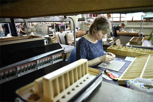 6月7日,工作人员在俄罗斯图拉组装巴扬手风琴部件。 新华社发(亚历山大摄)
