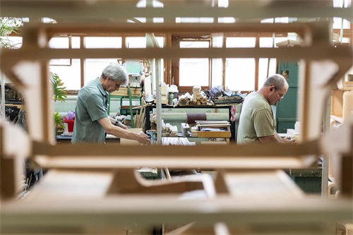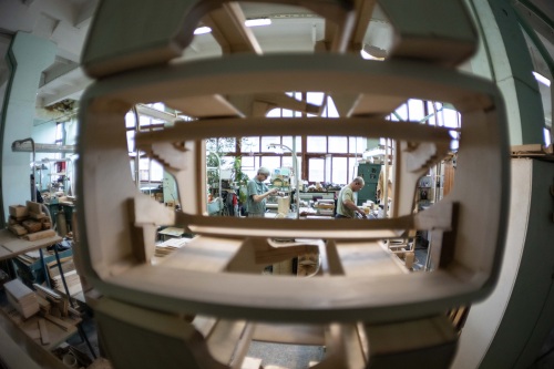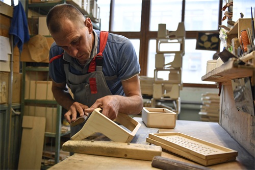6月7日,工作人员在俄罗斯图拉加工手风琴琴身。 新华社记者 白雪骐 摄