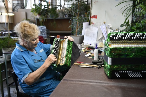 6月7日,在俄罗斯图拉,工作人员为即将出厂的巴扬手风琴试音。 新华社发(亚历山大摄)