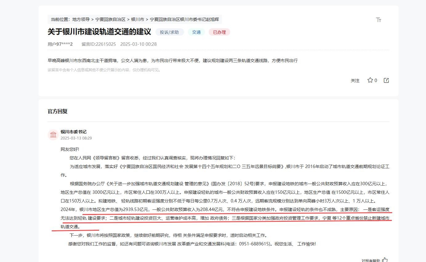让我们看看和我们同为西北城市的银川。看看银川市政府对地铁和轻轨的官方答复:银川不满足地铁建设条件,也不满足轻轨建设条件。原因一是客流达不到轻轨建设条件,二是轻轨投资巨大,财政不满足。那银川的这三个条件和宝鸡比如何呢:我网上查了一下,去年银川生产总值 2900多亿,地方财政收入208亿,城镇人口240多万。宝鸡呢,去年生产总值约2700亿,地方财政收入108亿,城镇人口180多万。宝鸡财政收入和城镇人口都要远远少于银川,而且银川还是省会,能得到省上的大力支持,如果银川客流、财政都不达标,那宝鸡可想而知。