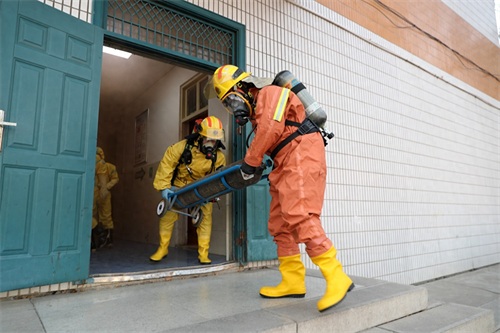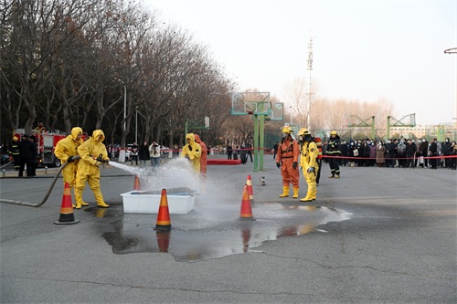 接到报警后,黄河大道消防救援站救援人员紧急出动。救援车辆抵达现场后,学校保卫处负责人立即向消防救援人员报告现场情况。消防指挥人员了解情况后紧急制定处置方案,身着防化服的消防员把泄露钢瓶从实验室转移至室外指定地点,采用碱水对氯气罐进行碱中和反应,完整演示了“稀释+中和+吸附”的处置流程,随着对现场气罐、实验室、楼道清理工作的完成,本次演练取得了圆满成功。演练结束后,该校校长表示,通过此次演习,还原真实事故情况,既达到以练促改的目的,又培养了学生们树立“学消防、懂消防、用消防”的安全意识。