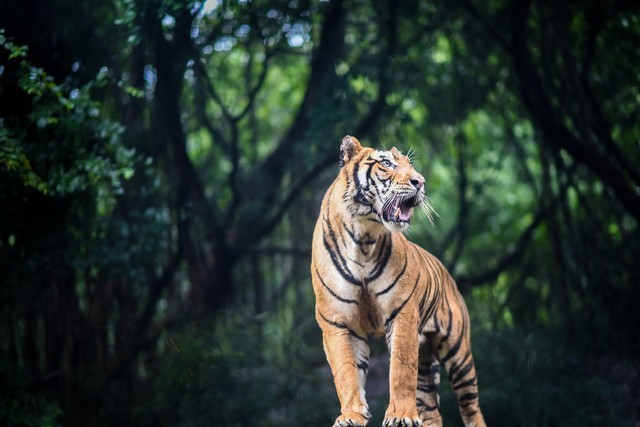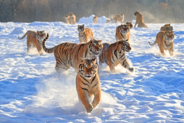 东北虎通常是孤独生活的动物,每只虎有自己的领地,领地范围广阔,可以达到数百平方公里。它们是夜行性动物,擅长在夜晚狩猎。东北虎的主要食物包括鹿、野猪、猎物群中的其他动物以及有时甚至是熊。它们会悄悄接近猎物,然后用强大的后爪和锋利的爪子发动突袭。繁殖季节通常在冬季,雌性虎怀孕期约为3.5个月,每胎通常产下2到4只幼虎。