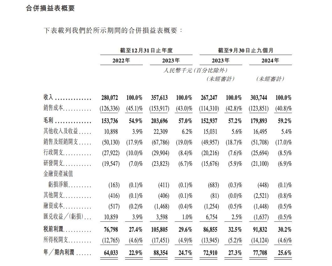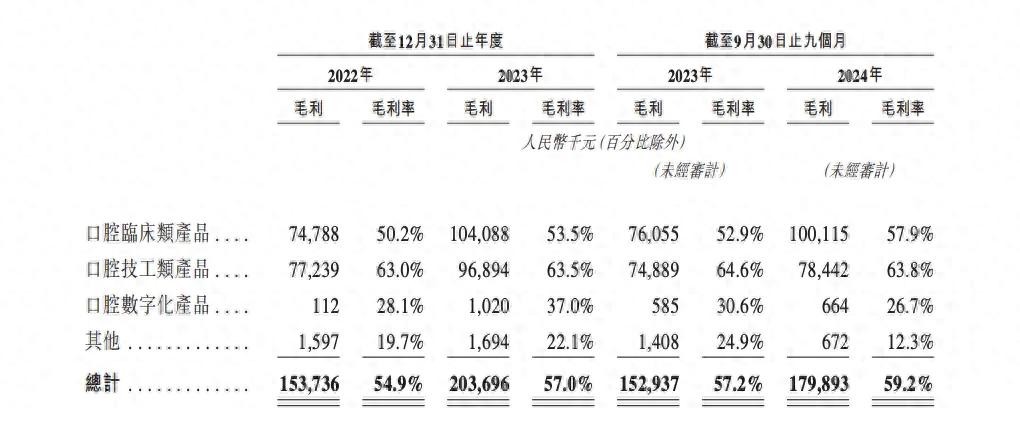 财务层面,2022年、2023年和2024年前九个月,沪鸽口腔的营业收入分别为人民币2.80亿、3.58亿和3.04亿元,相应的净利润分别为人民币6403.3万、8835.4万和7770.8万元。同期公司毛利率水平稳重有升,目前接近60%。