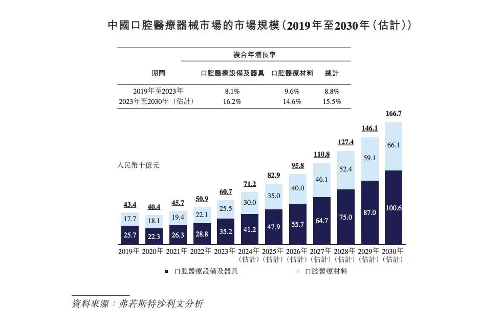 中国口腔医疗器械市场规模则由2019年的人民币434亿元以8.8%的复合年增长率增长至2023年的人民币607亿元,预计于2023年至2030年将以15.5%的复合年增长率增长,并于2030年达到人民币1,667亿元。