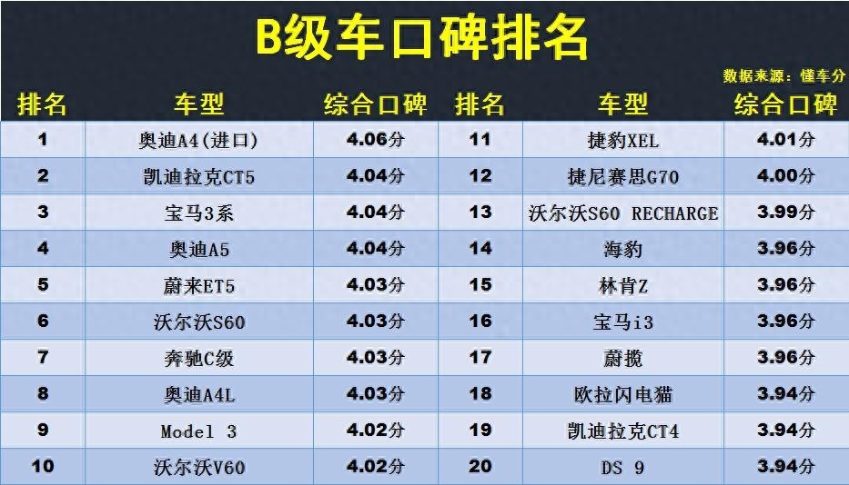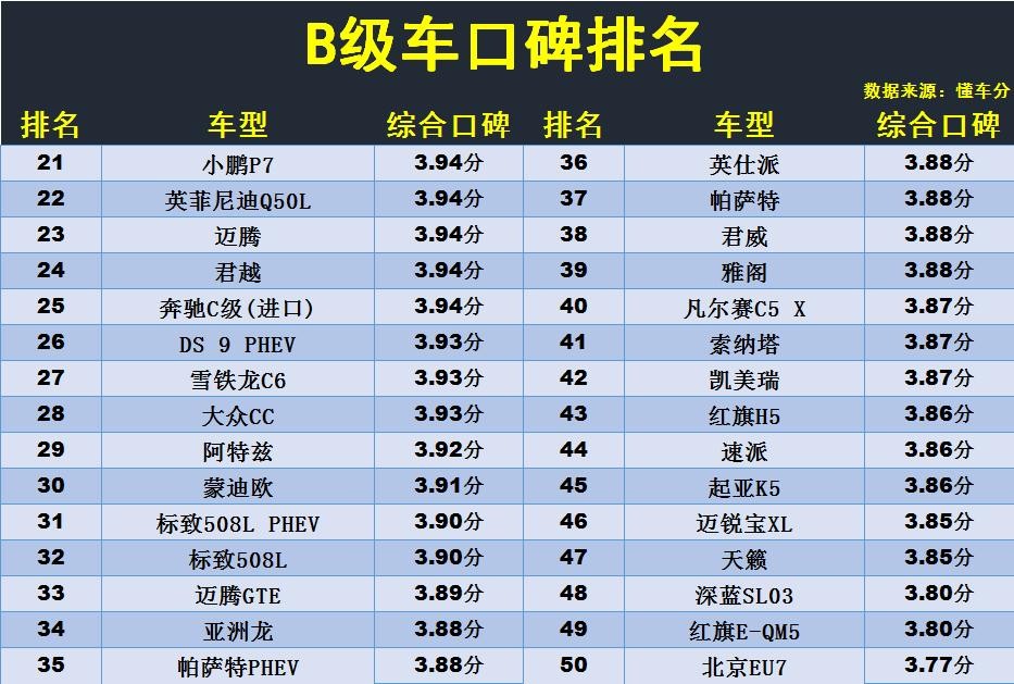 导读:随着国民生活水平不断提升,大家对汽车品质要求也是越来越高,而B级车的产品定位比较适中,品质表现也比较出众,所以受到了很多消费者的青睐。不过选购B级车也别乱买,根据最新B级车口碑榜单(懂车分榜)来看,宝马3系、奥迪A4L、奔驰C级和沃尔沃S60等豪华B级车的口碑评分都很出色。比亚迪海豹、宝马i3、欧拉闪电猫和特斯拉Model 3等新能源B级车,口碑评分也都非常靠前。而传统合资B级车的整体口碑表现不是特别理想,迈腾和阿特兹的评分还在3.9分以上,而亚洲龙、帕萨特和雅阁的评分都不足3.9分。凯美瑞仅排名42位,口碑评分与红旗H5、斯柯达速派和日产天籁比较接近。别乱买!最新B级车口碑榜:3系、A4L前10,迈腾第23,雅阁第39!
