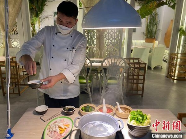 图为1月10日拍摄的厨师为海南椰子鸡火锅调制蘸料。 中新社