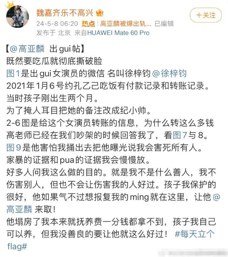 2024年5月,高亚麟被爆料出轨家暴。