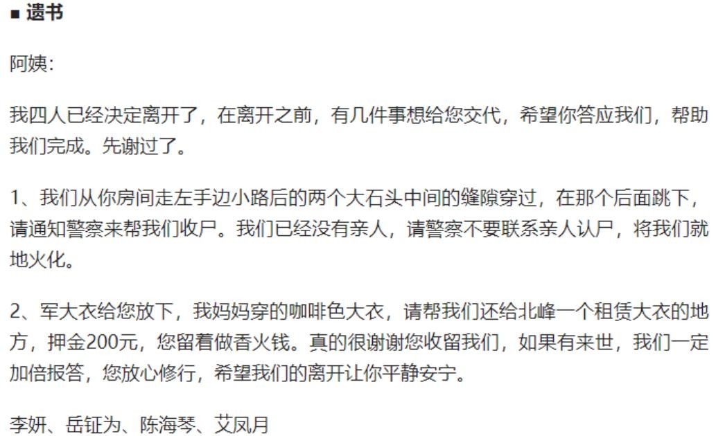 但是信中字里行间,无不流露出无尽的绝望和决绝,仿佛死亡才是他们唯一的解脱,崔师傅惊恐万分,选择了报警,搜救人员费了老大力气,终于在日月崖的山脚下找到了四具辨认不清的遗体,他们的生命在暴风雪中突然画上了句号。
