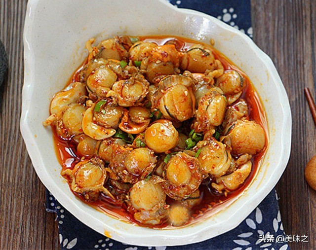 扇贝肉300克、辣椒粉2茶匙、桂皮1小段、香叶3片、八角2粒、蒸鱼豉油2茶匙、蚝油1茶匙、白糖半茶匙、花椒粉少许、花椒20粒。