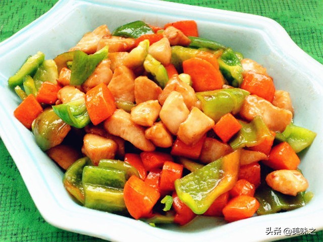 鸡胸肉100g、胡萝卜100g、青椒100g、油适量、盐适量、蚝油适量、味精适量、葱适量、生抽适量、酱油适量、淀粉适量、姜适量。