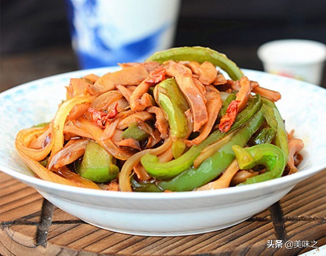 9、青椒入锅,翻炒均匀即可出锅装盘。