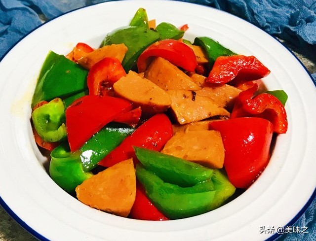 5、放入青红椒,加入生抽两勺,蚝油一勺炒至辣椒熟即可,这道菜可以不放盐,因为香肠本身有味道。