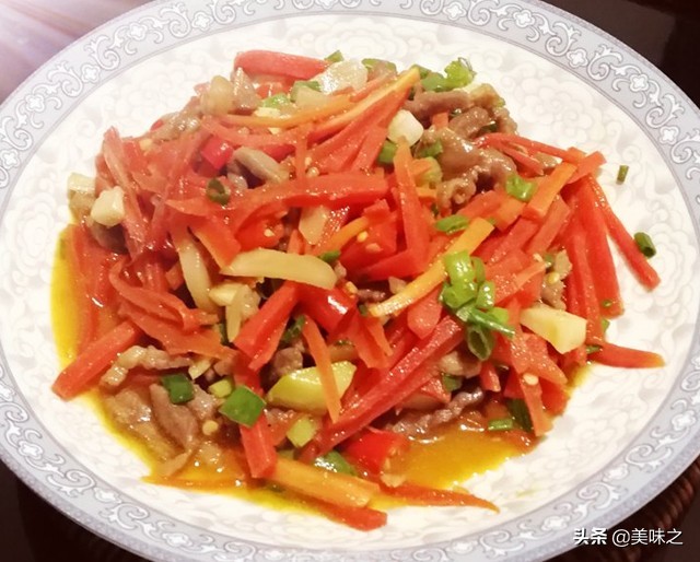 牛肉丝200g、胡萝卜丝100g、酸辣椒2颗切粒、酸姜1块切丝、小葱1颗切粒、料酒1勺、生粉2匙、盐1匙、生抽2匙、黑胡椒1匙。