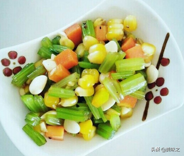 1、杏仁2勺,芹菜300克,半个熟玉米的粒子,