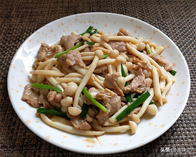 瘦肉120克、白玉菇200克、盐2克、鸡精2克、胡椒粉2克、生粉3克、葱2棵、蚝油1勺。