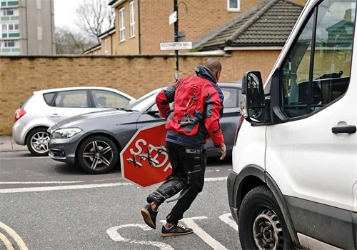 然而,当他和其他路人正在欣赏班克斯的作品时,一个身份不明的男人出现了。二话不说,他爬上交通标志杆,试图用手撼动那块有班克斯作品的标识牌。