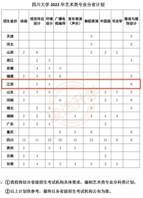 四川大学2022年艺术类招生专业共十个,具体包括绘画、中国画、视觉传达设计、环境设计、书法学、服装与服饰设计、广播电视编导、舞蹈表演、音乐表演(声乐)和美术学(理论研究)。具体分省计划请见图。
