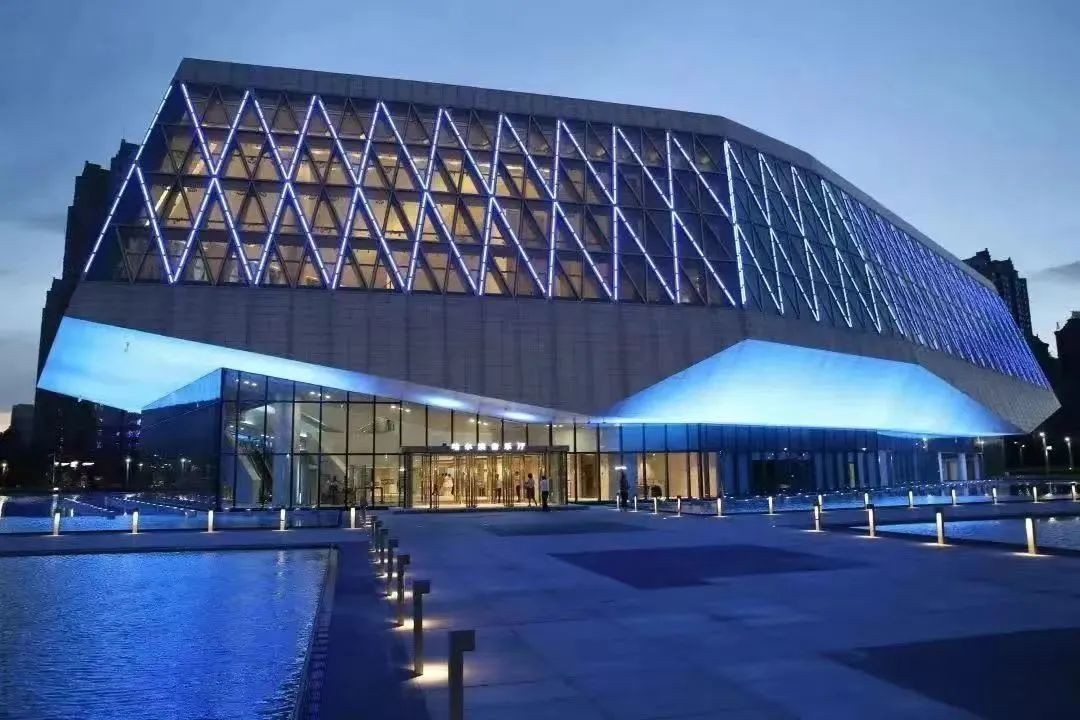 哈尔滨音乐厅整体造型采用“浮游冰晶”的设计,在夜空的映衬下,“浮游冰晶”晶莹剔透,犹如一颗璀璨的钻石点亮了哈尔滨这座“音乐之城”的夜晚。